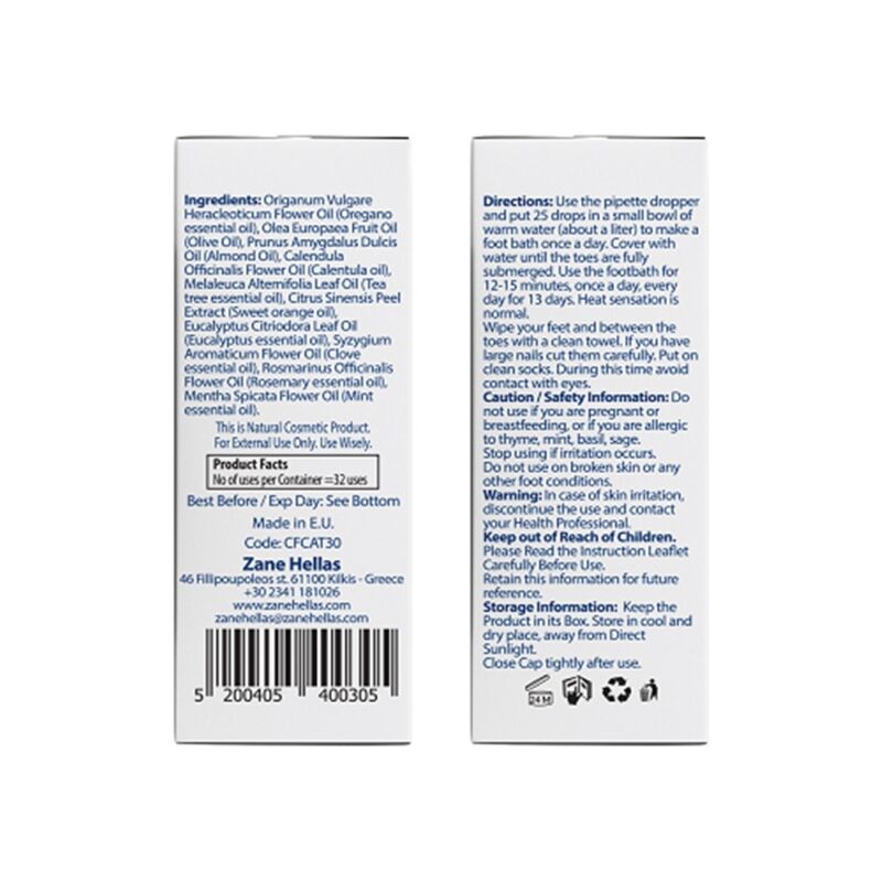 Makacs bőrgombásodás? Kellemetlen lábszag? Égő viszkető érzés? A Zane Hellas FunguCept bőrgomba / lábgomba elleni cseppek 99.9%-ban elpusztítják a gombákat, és már egy használat után enyhíti az égő, viszkető érzést. A teljes kezelés kevesebb mint 2 hét! Szabaduljon meg a bőrgombától természetes úton és gyorsan! Magas hatékonyság, gyors és látható eredmények: a lábgomba, a viszketés és a kellemetlen lábszag ellen, valamint a körmök színében. A Zane Hellas bőrgomba elleni cseppek 100% természetes összetevőkből áll: oregánó olaj, extra szűz olíva olaj, teafa olaj, eukaliptusz olaj, mandula olaj, körömvirág olaj, szegfűszeg illóolaj, rozmaring illóolaj, menta illóolaj + C és E vitaminnal.